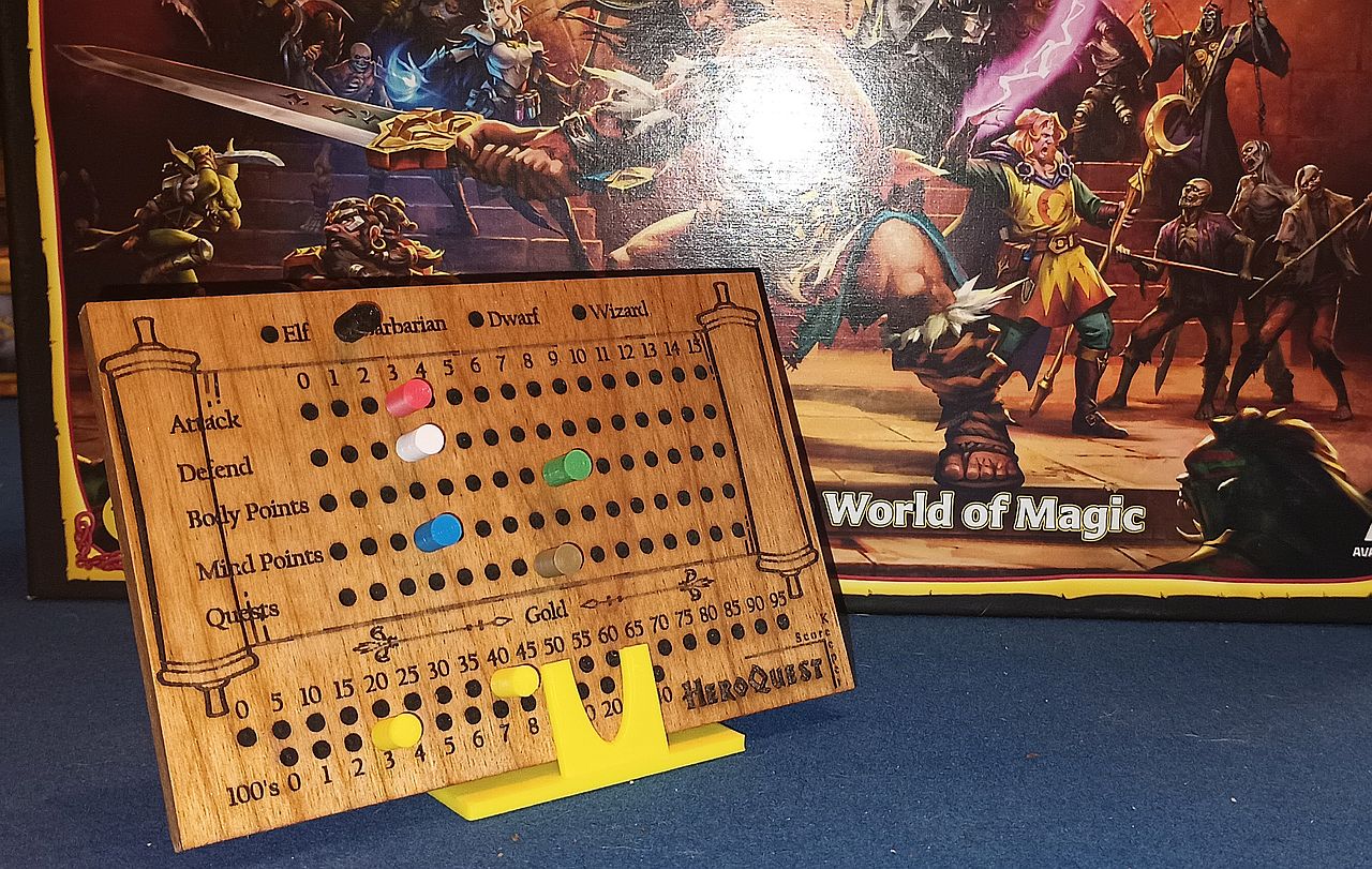 Level up your Hero Quest adventures with our handcrafted wooden scorecard, designed for immersive gameplay and seamless stat tracking. Say goodbye to messy paper and pencil – this beautifully crafted board combines form and function, featuring color 3D printed pegs that let you easily adjust your stats, gold, and progress in real-time.